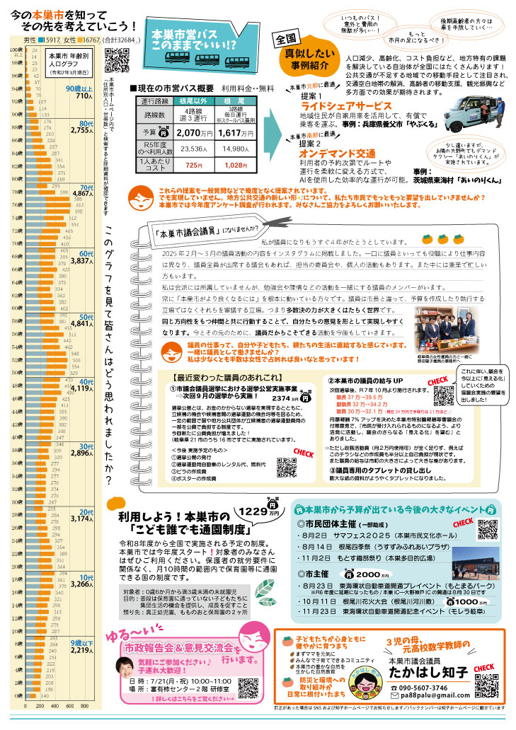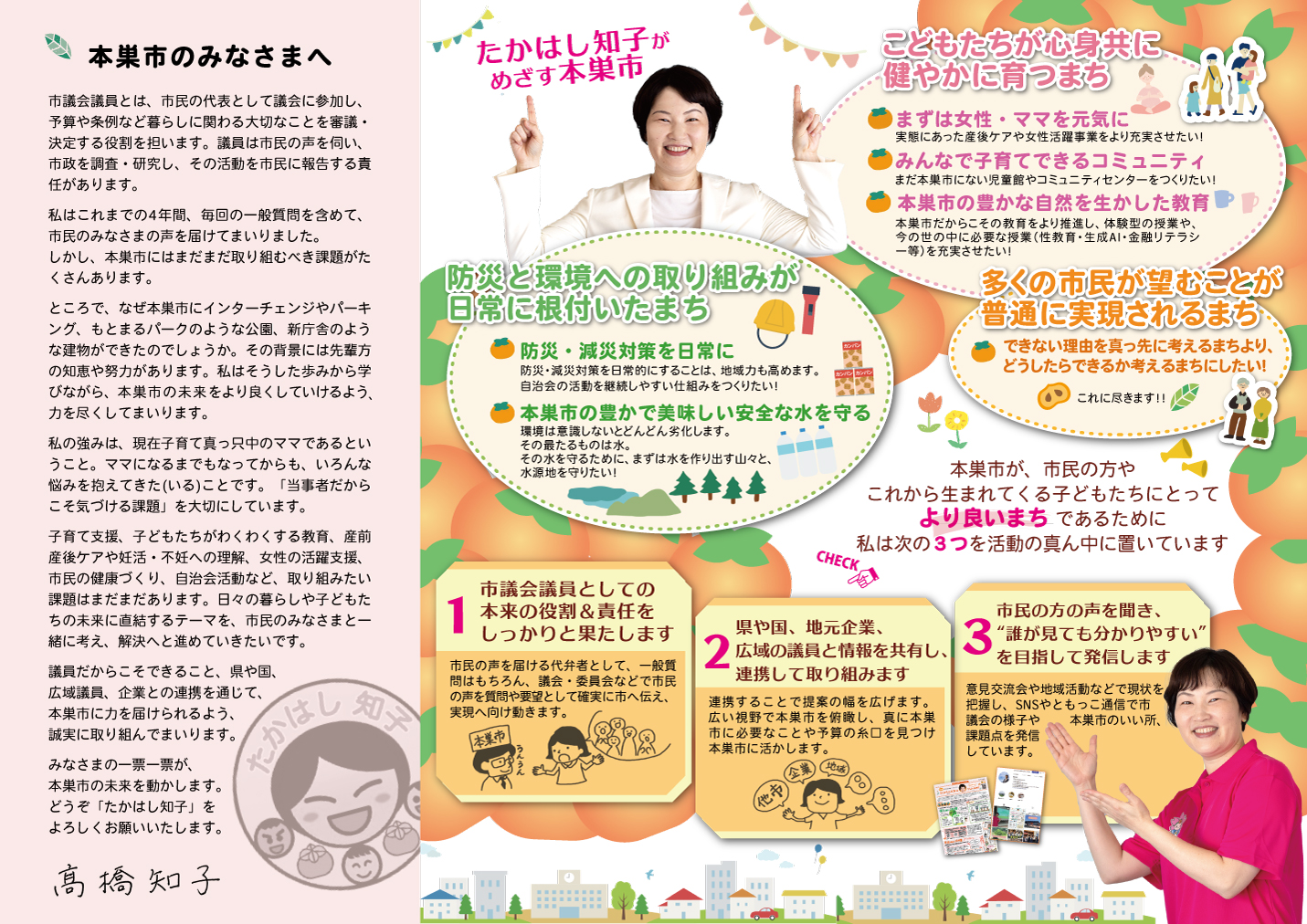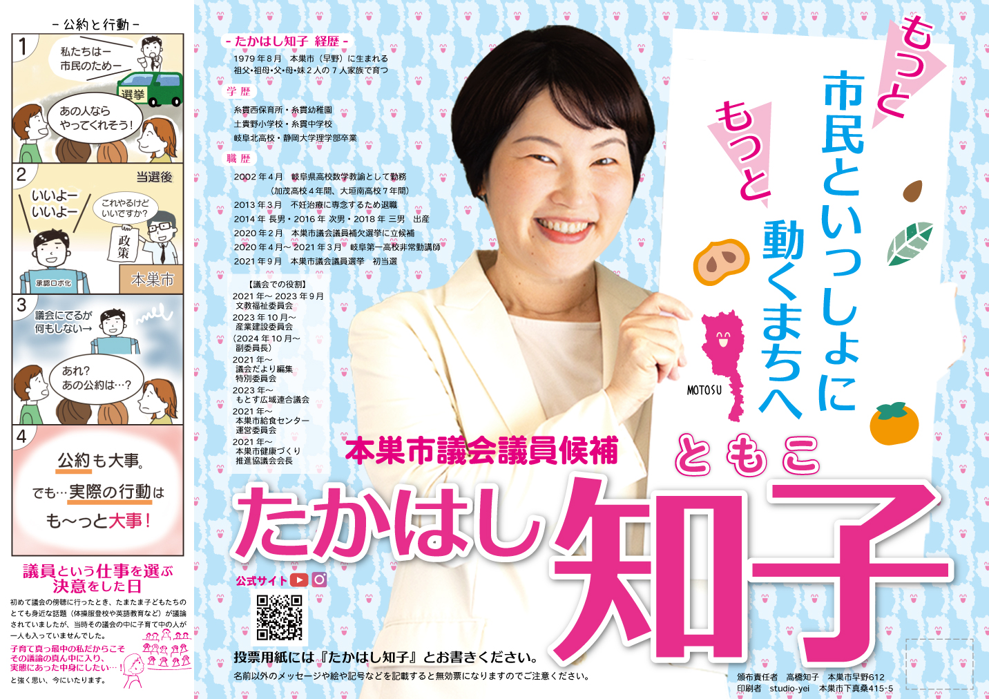 ママと政治の間に「高 」い壁を感じるから、私はママと政治の懸け「橋 」になりたい。政治のことをママたちがもっと「知」ったら、もっともっと「子」育てしやすい市になるかも!